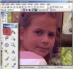 Commencer par recadrer votre photo pour ne garder que l'essentiel. Pour cela, cliquer sur l'outil Rectangle Select dans la palette d'outils (Tools). Sélectionner sur la photo le rectangle représentant la zone à garder. Cliquer avec la souris sur le point haut gauche du rectangle et glisser la souris en gardant le bouton appuyé vers le côté bas droit du rectangle. Recadrer la photo dans le menu Image > Crop to Selection.